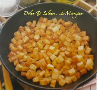 Sbucciate le patate, tagliatele a dadini di circa un centimetro di lato e mettetele per 1 ora in una terrina coperte con acqua fredda salata. Scolatele e asciugatele con un canovaccio. Ponete la padella su fiamma vivace, mettetevi l'olio e lo strutto e, quando iniziano a fumare, aggiungete il pezzetto di pane secco. Appena questo comincerà a dorare toglietelo e versate nella padella le patate. Continuate la cottura rigirando ogni tanto con delicatezza in modo che non si attacchino alla padella e coloriscano uniformemente.