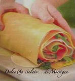 Ricoprite ora con l'altro rettangolo di pasta e un altro strato di ripieno e avvolgete la pasta formando un rotolo, sistematelo poi su un telo e legatelo alle estremità con dello spago.