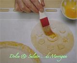 Con i ritagli di pasta formate delle stelline, dei dischetti o altre forme decorative secondo il vostro gusto. Inumidite la superficie del disco più piccolo rimasto che servirà da coperchio, applicatevi le decorazioni e disponetelo sulla placca da forno accanto all'altro.